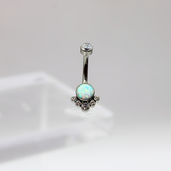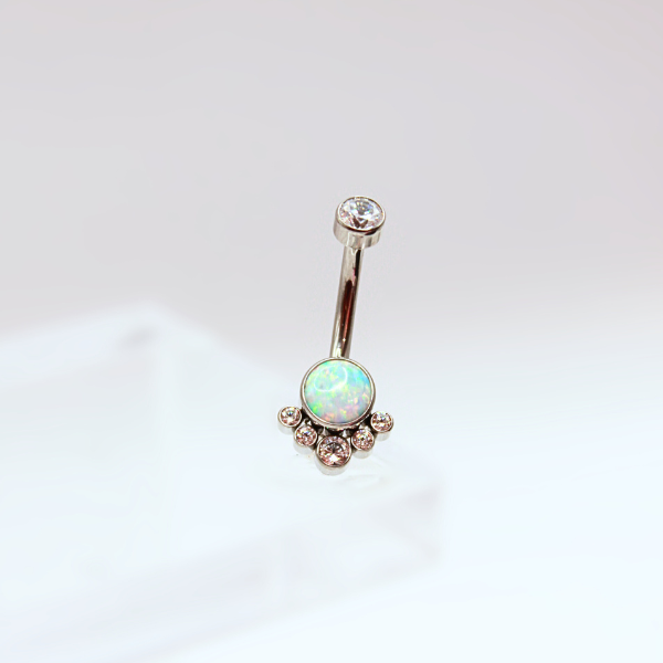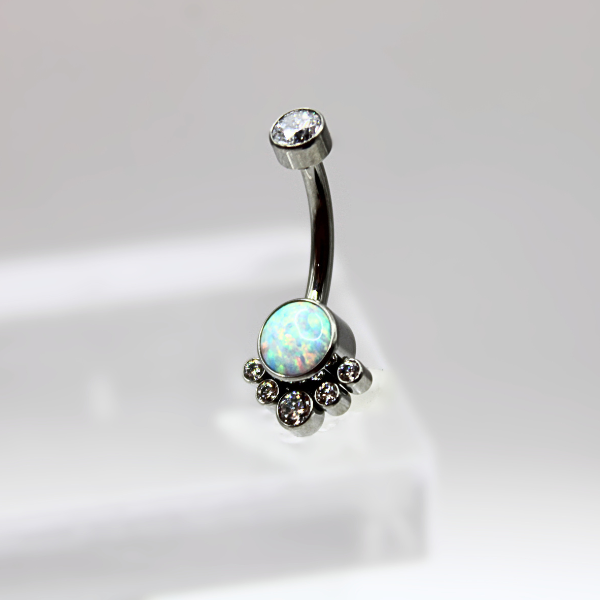 Barbell Curvo Titanio para Ombligo diseño Opalo blanco con 5 mini pastillas